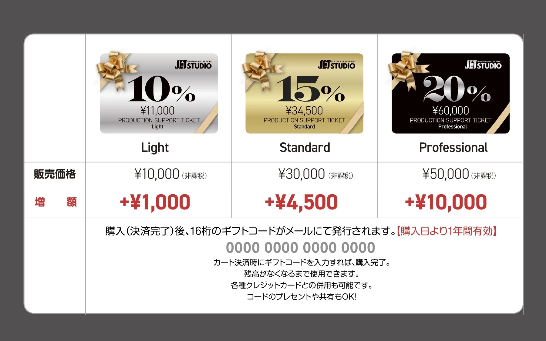 詳しくはこちらJET STUDIO 1周年を記念して、日頃ご利用していただいているお得意様やこれから多く制作される方に向けた「制作支援チケット(ギフトカード)」を販売します。